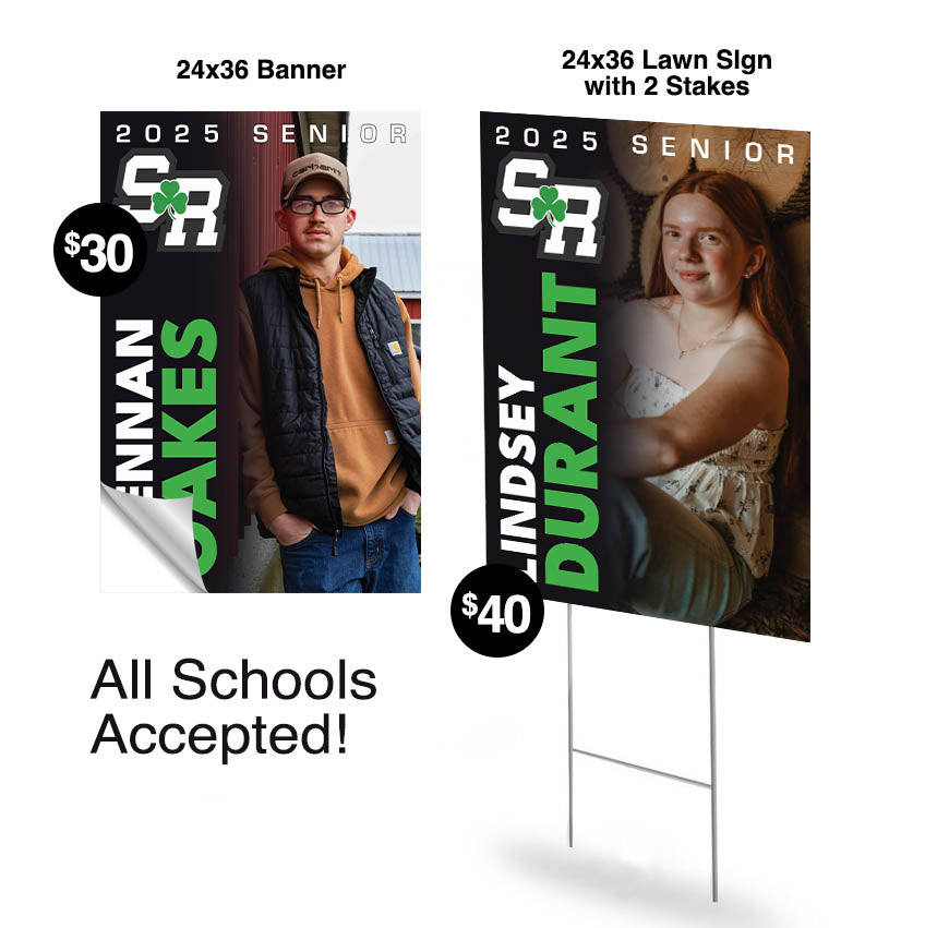 Your students photo will be printed on 13oz vinyl with pole pockets at the top and bottom or on corrugated plastic to be able to be displayed. Both sign options are outdoor vinyl and will survive outdoors for years. All school and universities are accepted.